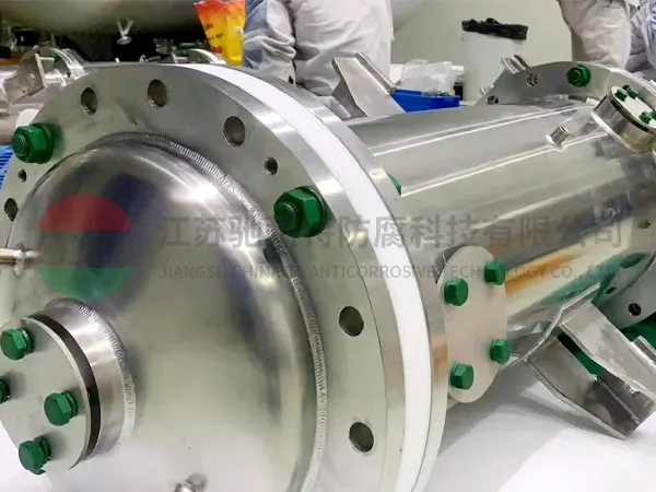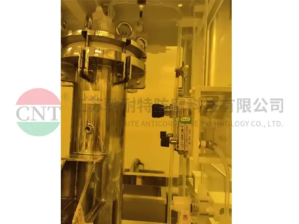 半导体聚合物过滤后既要考虑到筒体内壁没有物料残留,又要考虑高纯洁净以及耐腐蚀性能,所以选用高纯 PFA 喷涂层,该涂层成型后没有接缝,整体平滑,光亮,无死角,优于内衬工艺。
