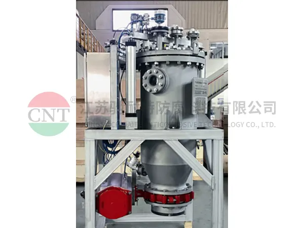 半导体聚合反应后的过滤环节既要考虑到筒体内壁没有物料残留,又要考虑高纯洁净以及耐腐蚀性能,选用高纯 PFA 喷涂层,主要用于光刻胶产业链中的重要精密过滤环节。高纯 PFA 涂层金属杂质可以控制在 1 个 PPb 以内,更高纯度要求下可以做到 0.1 个 PPb。目前用于聚合反应的过滤设备以三合一多功能过滤机、烛式过滤器、微孔精密过滤器为主。喷涂最大尺寸 10m³(如果批量比较大,我们可以定制更大的烤炉), 厚涂厚度范围 300μm 至1000μm,涂层颜色:常用米黄色和黑色。